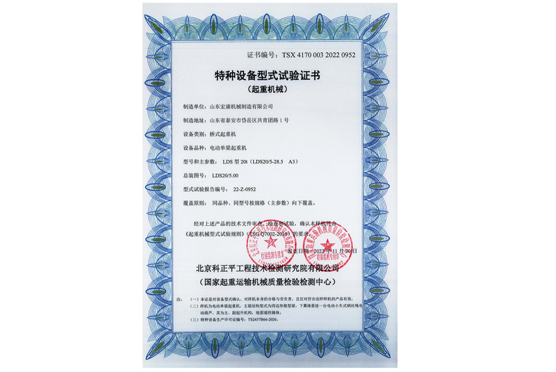 電動(dòng)單梁橋式起重機(jī)型式試驗(yàn)合格證